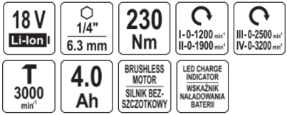 Бясшчотачны ўдарны вінтакрут-шрубакрут 18V, 1/4", 230 Nm, 4,0 Аh, YATO (YT-82798)