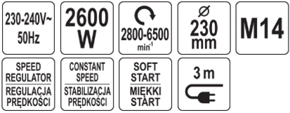 Вуглашліфавальная машына з рэгуляваннем хуткасці 230мм, 2600W, PRO, YATO (YT-82106)
