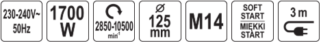 Вуглашліфавальная машына 125мм з рэгуляваннем, 1700W, YATO (YТ-821024)
