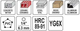 Рабочая частка інструмента выканана з сплаву з даданнем карбіду вальфраму YG6X, які забяспечвае эфектыўнасць, шматзадачнасць, надзейнасць і працяглы тэрмін службы.