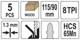 Палотны для электралобзіка па дрэве 8 TPI, 5шт YATO (YT-3409)