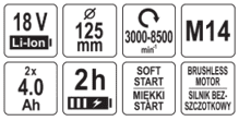 Аккум. бесщеточная углошлифовальная машина 125мм,18V, 2х4,0Ah, YATO (YT-828252)