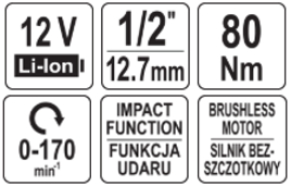 Бесщёточная аккум. ударная трещотка 12V, 1/2'', 80Nm, без АКБ, YATO (YT-829021)