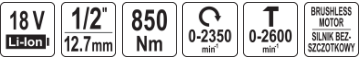 Аккумуляторный бесщеточный ударный гайковерт 18V, 1/2'', 850Nm, без АКБ YATO (YT-827793)