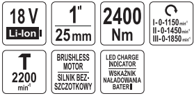 Аккумуляторный бесщеточный ударный гайковерт 18V, 1'', 2400Nm, 6,0Аh YATO (YT-828079)