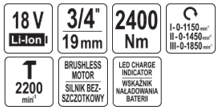 Аккумуляторный бесщеточный ударный гайковерт 18V, 3/4'', 2400Nm, без АКБ, YATO (YT-828074)