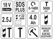 Аккумуляторный перфоратор SDS Plus, 18V, 2,5J, BL, без АКБ, YATO (YT-827723)