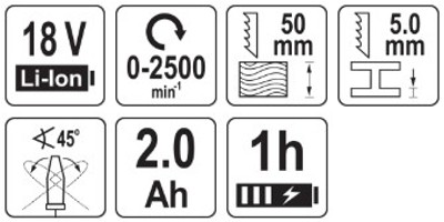 В комплекте: лобзик, литий-ионный аккумулятор 18В 2Аh, быстрозарядное устройство (1 час для аккумулятора 2Аh).