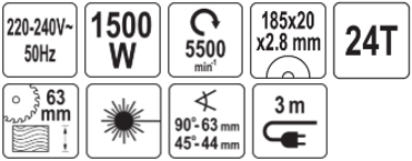 -Макс. глубина реза: 63мм (90˚), 44мм (45˚).