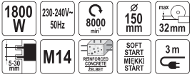 Высокая мощность 1800Вт, генерируемая коллекторным двигателем с медной обмоткой, даёт возможность для одновременной работы с двумя дисками.
