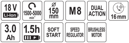 Бесщеточная эксцентриковая шлифмашина 18V, 150мм, 3,0Ah, YATO (YT-82920)