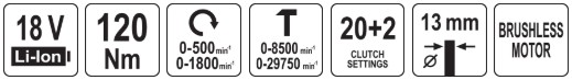Бесщеточный ударный шуруповерт 18V, 120Nm, без АКБ YATO (YT-827791)