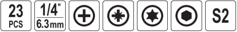 - Биты 25 мм/18шт: PH0, PH2 - 2 шт., PH3; PZ0, PZ2 - 2 шт., PZ3; HEX4, 5, 6; T20 - 2 шт., T25 - 2 шт., T30 - 2 шт., T40.