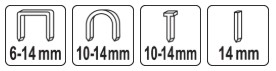 Степлер предназначен для забивания стандартных прямоугольных стальных скоб длиной от 6 до 14 мм, а также круглых скоб длиной от 10 до 12 мм для крепления электропроводки. Ещё одной полезной функцией является возможность забивать специальные гвозди длиной от 8 до 14 мм.